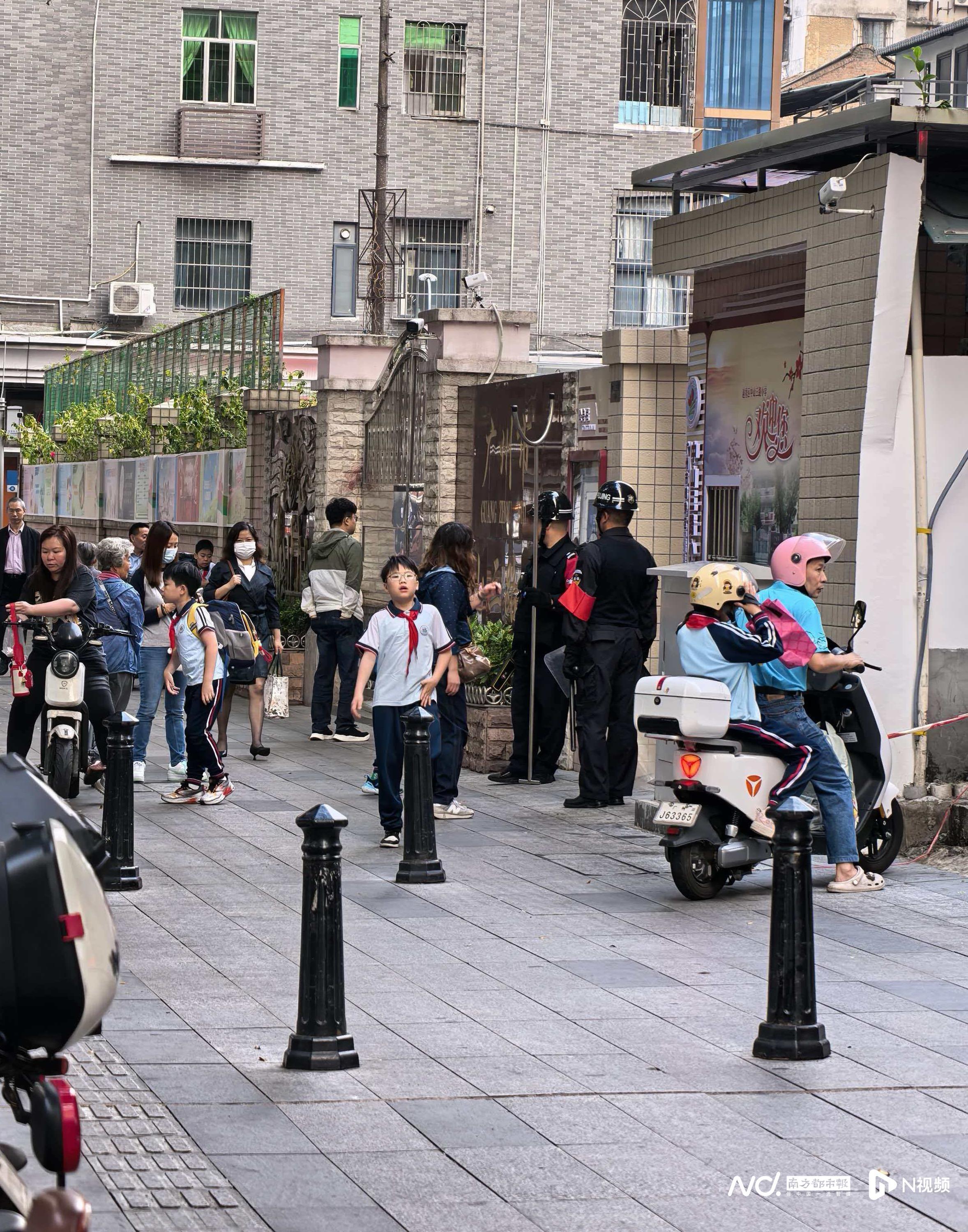 当天早上同一时段,在越秀区中山三路小学,记者看到校门口仅有民警和安保人员站岗、维持秩序,并未看到其他人员在门口值守。