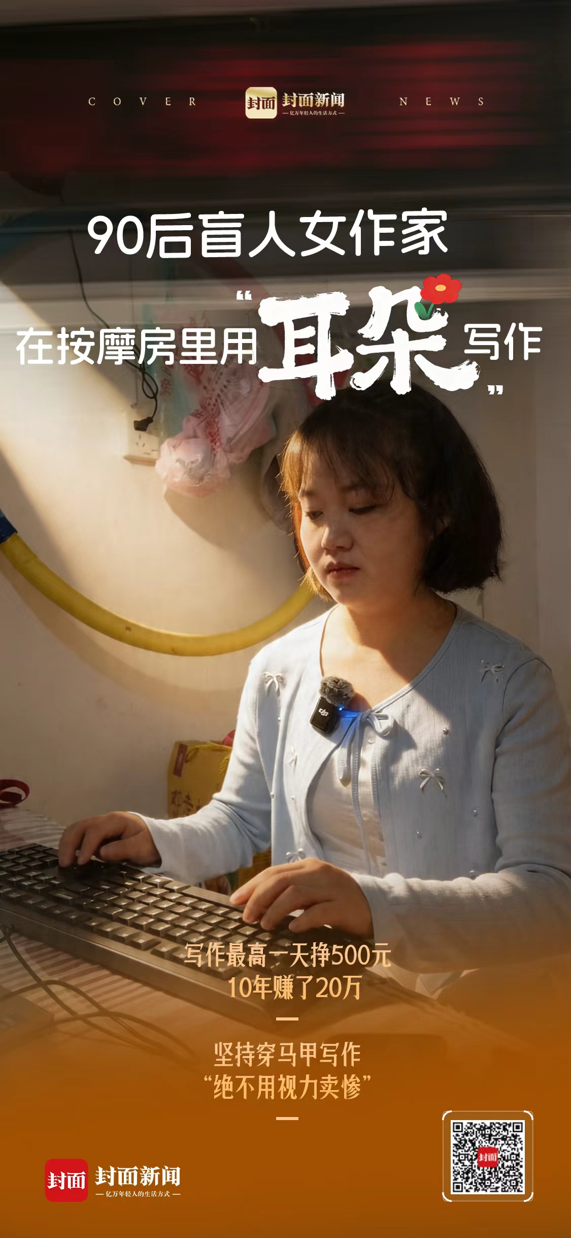 “原来码字也能养活自己!”她格外欣喜。于是,白天她在按摩店干活,晚上打开电脑,一个字一个字敲。读屏软件把屏幕上的字念出来,她听着,接着敲。